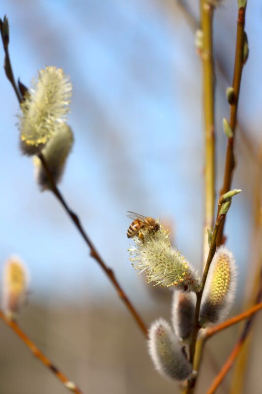 Pysäköintipaikalta johtaa leveä polku ensin pellonlaitaa myötäillen, sitten metsän siimekseen sukeltaen. Ensimmäiset merkit keväästä näkyvät heti jo ennen kuin saavutamme Vaisakon luonnonsuojelualueen. Polun varrella loistavat leskenlehdet kuin pienet auringot. Paju on avannut mesibaarinsa ja pajunkissoissa käy tasainen hyönteisten pörinä.